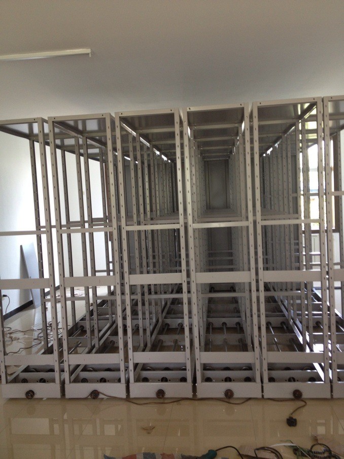 1、移動:可單列或多列一起在導軌上行走,每列具有手剎制動裝置(自鎖柄)。自鎖柄在OFF位置時,架體不能移動,在ON位置時,架體可移動,每列架體的側(cè)面板上有標簽框,移動列底務上有防倒裝置,每個組合箱體的前后各一列裝有總鎖,用于整體的鎖 閉,起到保密作用,導軌的端部安裝限位裝置。